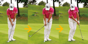 この画像は、先ほどのアプローチより少し動きが大きくなった状態です。振り幅が大きくなるにつれて腕、下半身の動きが大きくなるだけなんです。動きが大きくなってもパターで動いていた胸、両肩の動きは、同じように動かなければならないのです。この大事なポイントをおさえて練習すると、上達がはやくなると思うので是非参考にしてくださいね。
