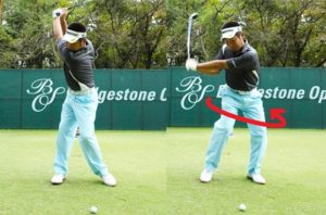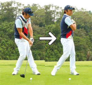 この画像は、姿勢が悪い状態での回転です。捻転差もできずバランスも崩れてます。アドレスでは、姿勢を気にするかもしれませんが、ダウンスイングになると姿勢が崩れて回転してしまうアマチュアの方が非常に多いです。ですから胸を張って姿勢を意識して回転する練習をしてほしいです。意外に難しいので頑張りましょう!