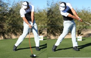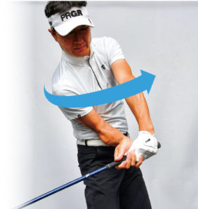 この画像のように両脇をしめて、右肘を内側に入れこんでしまいます。こうなるとフェースが開きボールをこすって飛距離がでません。(ボールを押せないから)