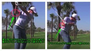 この2つの画像は、ダウンスイングで両腕が下におりながら腰の回転、重心移動が行われています。理想的です。両腕の上げ下ろしは、簡単そうで非常に難しいのです。なぜならリラックス、力みをとらなければいけないからです。皆さんもなるべく力まないように練習してみて下さいね。