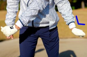 上の画像の右側は手首を返す動き方です。この動き方だと脱出が非常に難しいです。左側の画像は理想の手首の使い方です。下の画像を参考にして下さい。左手の甲がやや上を向いたまま動かすイメージです。動かしているのに手首の角度がかわっていません。この手首の使い方をマスターするだけでバンカーショットが好きになるかもしれませんよ。実際には、腰の回転も必要ですが。練習してみて下さいね。