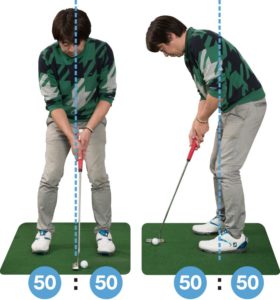 上の画像の3パターンでは1番左側が理想のアドレスです。どこが大切かと言いますと、両肘からクラブヘッドまでが直線になっているかです。この形だと安定してクラブをストロークしやすいのです。下の画像でも同じですよね。肘からヘッドまでが直線になっています。まずはここをチェックして下さいね。次にボールの位置!
