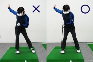 上の画像は上半身の捻転です。左側は腕だけでクラブを上げてます。右側が理想です。目標に背中が向いてますよね。下の画像の左側はスエーしてます。右腰が突き出してます。右側の画像はその場で回転してます。この形が理想です。バックスイングでは、大きくこの二つをチェックして練習してみてください。