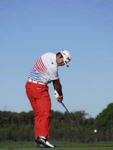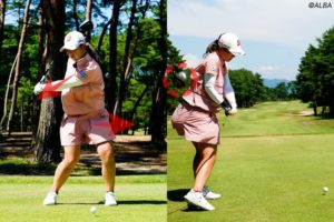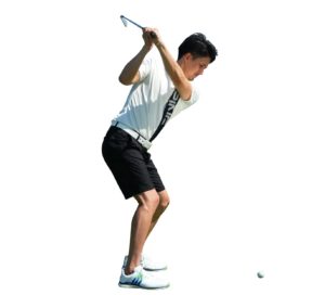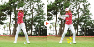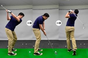 最初の画像が間違えているアドレスです。構えの時点から右肩がやや前にでて、両肩の向きが左側を向いて構えてます。このアドレスからスイングすると下の画像のようなダウンスイングになりやすいのです。こうなると特にドライバーなどは、ボールをこすって飛距離は全然でません。ですからまずは、自分のアドレスをチェックしてみて下さい。