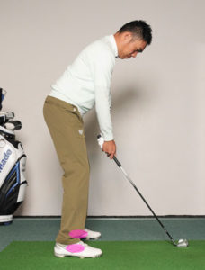 この画像のようにつま先でも、踵よりでもなく真ん中の重心で構えます。ですが、つま先上がりや、つま先下がりでは、この重心ではバランスが悪く上手くスイングができません。つま先上がりは、つま先重心にします。