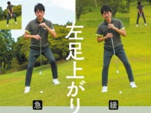 この画像の左側が正解です。右側は傾斜なりになります。このように構えるとボールが上がりすぎて距離が合いづらくなります。ですから左側の画像のように構えることにより平らな状態とかわらない飛距離がでます。この構えの為、傾斜の度合いによって重心が左足重心から右足重心にかわるのです。
