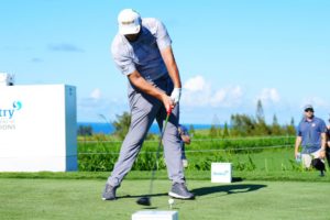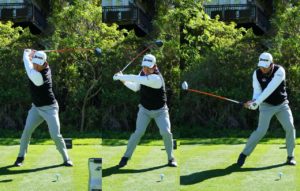 この画像の真ん中そして右側は、下半身がリードするにつれて上体も同じだけ動いてます。なので右側の画像では、腕が右腰のあたりまで下りてます。理想ですね。ダウンスイングでは、下半身リードが重要ですが、上体も同調して動かないといけないのです。下半身だけとか、上体だけでは、ミスに繋がるのです。スイングの大きさにかかわらず、(ハーフスイングでもアプローチでも)下半身と上体の同調が大事です。かなり難易度高めですが練習する価値はあるので参考にして下さいね。
