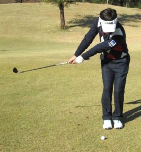 スライスの原因で、前回は、インパクトでの形でした。今回は、バックスイングの形です。トップオブスイングが浅いとスライスの原因になります。トップでは、自分の背中が目標を向く位、身体の向きをかえなければなりません。