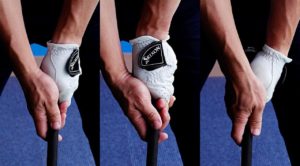 この画像の左側が正しい握り方です。真ん中がストロンググリップ(フックグリップ)。右側は、ウィークグリップ(スライスグリップ)。まずチェックしてほしいのは、左手の握り方です。画像の左側のように左手の甲の黒い部分が正面から程よく見えている向きで握っているか!画像の右側は、全然見えてないですよね。この握り方では、スライスになってしまいますので注意!(真ん中のように黒い部分が見えすぎているとボールが左に飛んだり、低い弾道になりやすいのでこれも注意して下さいね。)基本的なことですが、これを気にもう一度グリップをチェックしてみて下さいね。