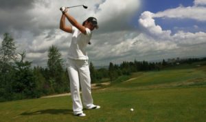 この画像の右膝に注目です。バックスイングで下半身は回転してもかまわないのですが、右膝の向き、位置は、アドレス(構え)の時と同じ向きを保つことが条件です。(なるべく)そうしないとスエー(横移動)をしてしまいスイング軸が安定しなく、スイングが崩れてしまうからです。スライスでお悩みの方、また参考にして下さいね。