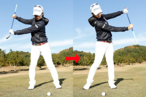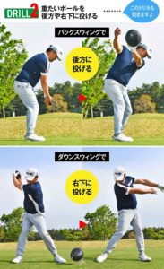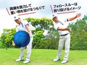 この2つの画像は、どちらもボールを両手で持って投げるイメージの動きです。覚えるためには、1番良い方法だと思いますので練習してみて下さい。このイメージで練習すると自然と下半身を使えるようにもなります。重いボールを投げるイメージだと上半身だけでは、遠くに投げることが難しく、自然と下半身が使えるようになると思います。マスターできるとショットとアプローチがすごく良くなります。参考にして下さいね。