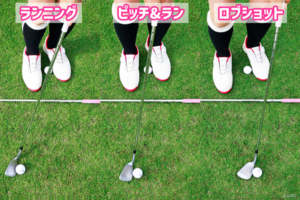 この画像のようにランニングは、右足の外、ピッチエンドランは、やく中央、ロブショットは、左足前位にセットします。クラブは、swで打ち分けをするのが良いと思います。1つのクラブで打ち分けをするのは、練習がかなり必要です。練習場でマスターしてからコースで試して下さい。簡単なのは、クラブを変えるやり方です。(同じ打ち方で打ち分けられるから)