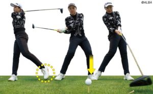 上の画像は、重心移動の練習の動き方です。わかりやすくトップで左足かかとを大きく上げてダウンスイングで下ろすやり方です。下ろしたときの身体の形がポイントです。ダウンスイングで左足に6割重心移動したときに、両肩の向きがアドレスに近い向きになっているところをチェックしてください。重心移動とともに身体の回転も同時に行われているのです。そこからさらに回転してインパクト〜フォローに向います!下の画像の真ん中がダウンスイングで左足に6割重心移動したところです。これも両肩の向きがほぼアドレスに近いですよね。このときの動き方がすごく重要なので参考にしてください。